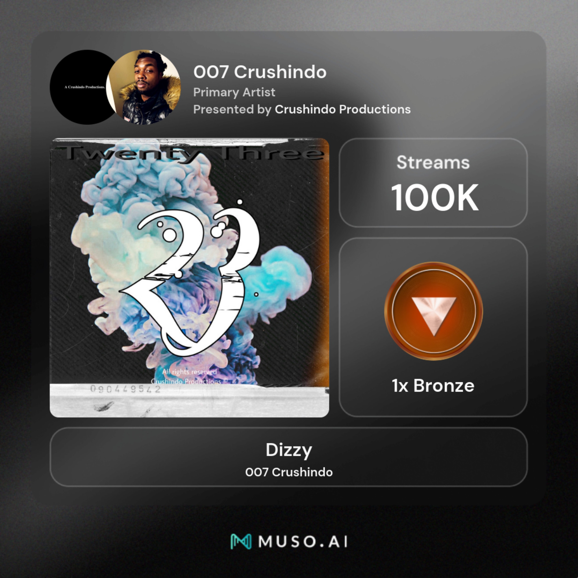 During his music career, 007 Crushindo created his own record label company to publish his music and own his rights. Crushindo Productions was created in late 2022, being an underground and upcoming independent record label. Crushindo Productions has reached millions worldwide from his music, his other creations, his podcast, and his character. He plans on making this label a major company shortly that will not only produce music, but will also produce movies, interviews, other record labels, sign many great artists and entertainers, and tons of other ventures that will make a huge impact in the music business.